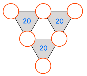 Para o primeiro caso da 20.ª edição do Campeonato Regional de Resolução de Problemas de Matemática, o AgenteX desafia-te a colocares seis algarismos diferentes, um em cada círculo, de forma que, em cada um dos triângulos sombreados, a soma seja igual a 20.